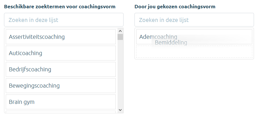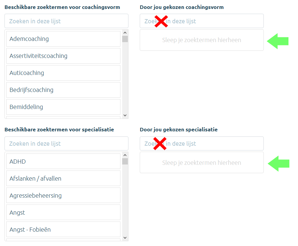 Wanneer de bezoeker zoekt op een bepaalde klacht of therapievorm (vb. psychotherapie), wordt jouw profiel enkel getoond wanneer jij die klacht of therapievorm ook geselecteerd hebt in je profiel bij de 'Zoektermen'. Zoekt iemand naar ondersteuning bij paniekaanvallen, dan verschijn jij enkel in de zoekresultaten indien je de term 'Angst - paniekaanvallen' hebt geselecteerd.