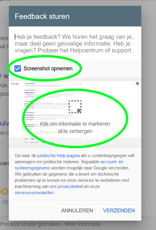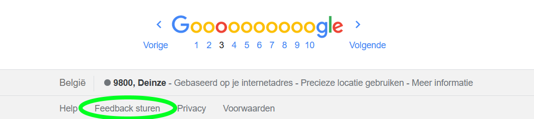 - Scroll naar de onderkant van de Googlepagina. Daar vind je de knop ‘Feedback sturen’. Klik op die knop.