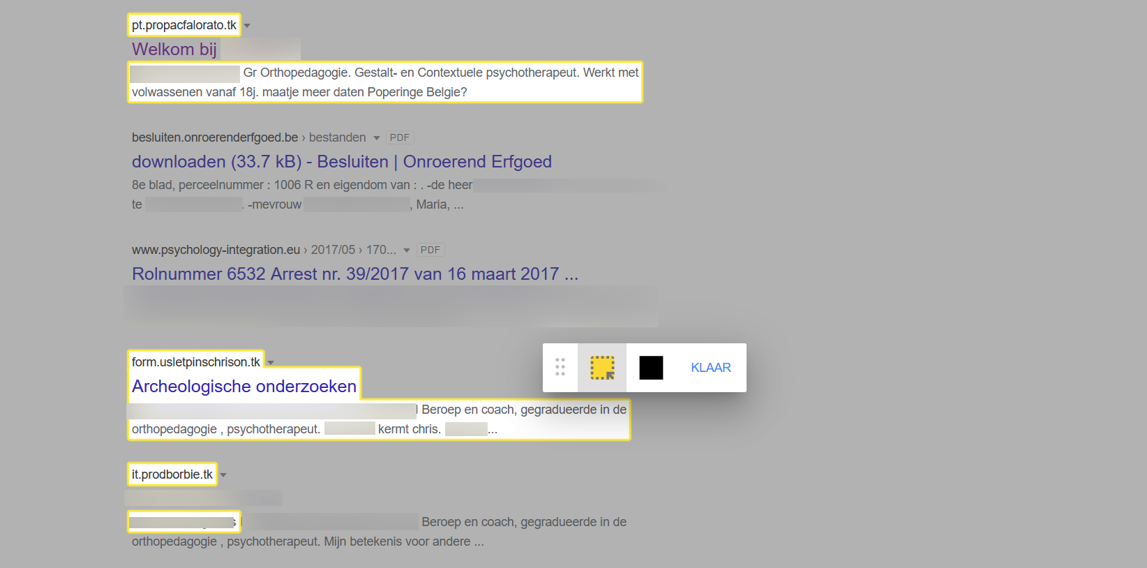 - Je kan nu naar boven en onder scrollen. Beweeg je muis over bepaalde delen van de resultaten, dan verschijnen die in balkjes met een geel randje. Klik ieder element aan waar jij aanstoot aan neemt, of wat niet klopt. Klik daarna op ‘Klaar’. (Alle volledige namen, adressen en locaties in het screenshot werden vervaagd om de identiteit van deze persoon te beschermen.)