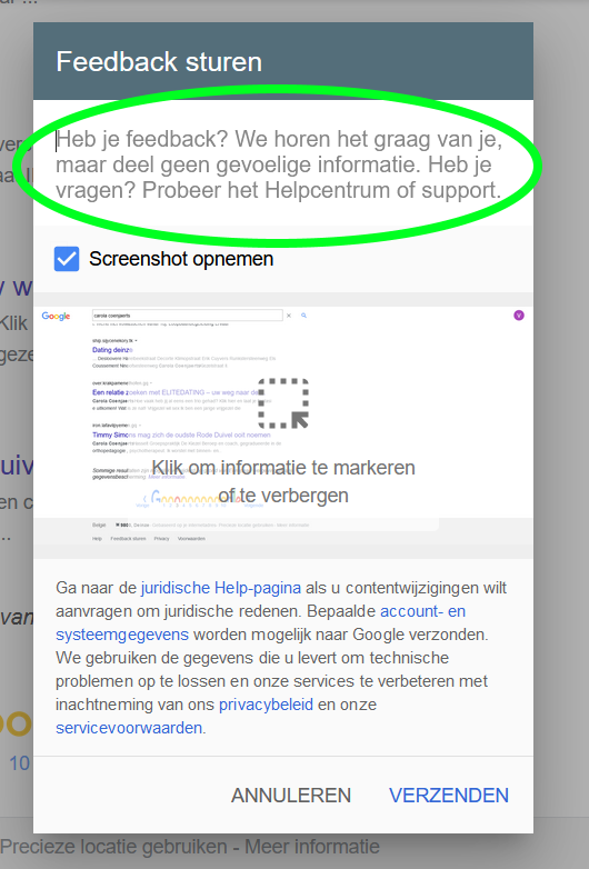 - Vul bovenaan bij ‘Heb je feedback?’ in waarom deze zaken net een probleem vormen voor jou. Vermeld zeker dat de informatie overgenomen is van jouw site, ons platform, of een andere doorverwijs-platform. Daarna klik je op verzenden, en zal je feedback verwerkt worden door Google.
